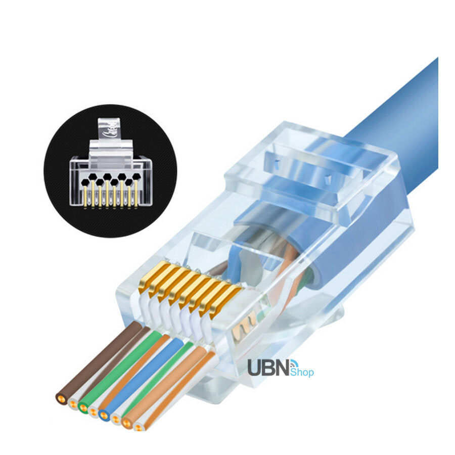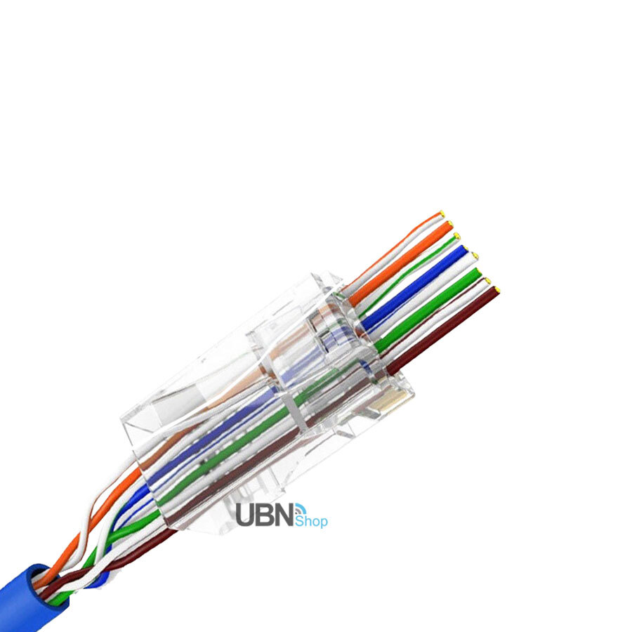 Cat6 RJ45 8P8C Modular Plug Wire Pass Through. The RJ45 gold plated modular plug for Cat 6 comes in a bag of 50. Simplifies twisted pair terminations by allowing the wires to be inserted through the connector and out the front making it easier for technicians to easily verify the proper wiring order. Electrical performance of the termination is optimized by pulling the connector down over the cable jacket and seating it tightly in the rear of the connector reducing the distance between the wire twists and contacts improving performance For use in Cat6 compliant data networks Package Contents: 100pcs plugs Details: * 50Pcs RJ45 Plugs Connectors * Have a hole in front , allows you to pass the RJ45 cable through. * The connector is the Unshielded Cat6 * Widely used for the RJ45 ethernet cable of 23AWG * Hole Diameter: 1.03mm(approx)