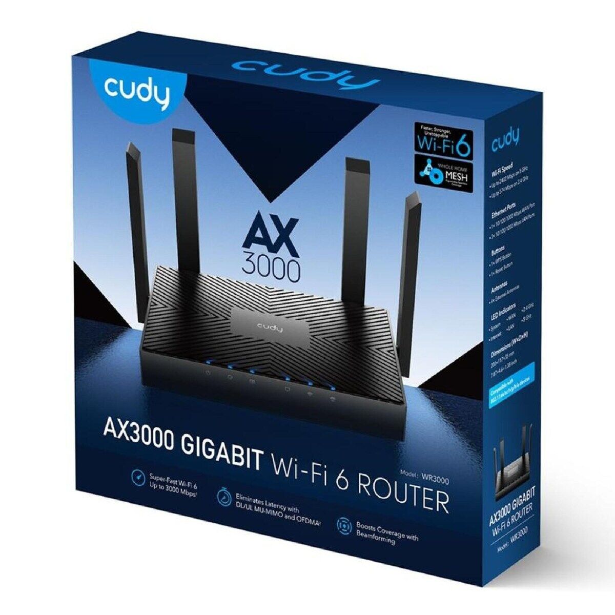 A WiFi 6 router with four Gigabit ports, suitable for home internet up to 1000 Mbps, connecting many devices, and reducing latency.