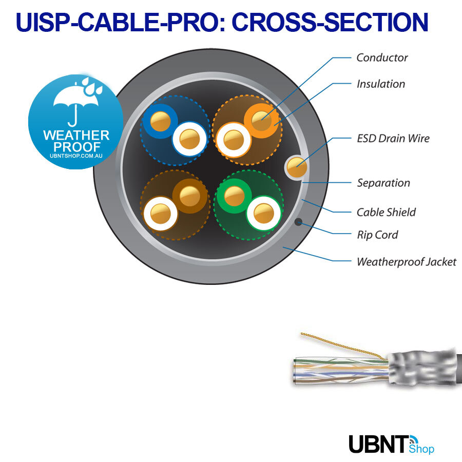Protect your networks from the most brutal environments with Ubiquiti’s industrial-grade shielded Ethernet cable, UISPCable™.A Category 5e, outdoor, carrier-class shielded cable with an integrated ESD drain wire.  UISP Cable PRO Pre-terminated.