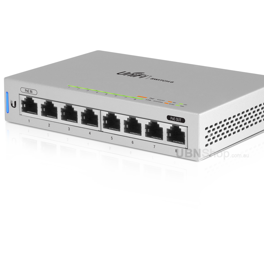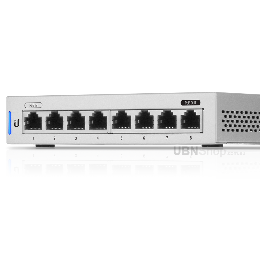 The US-8 is a PoE Powered 8-port gigabit switch with PoE Passthrough. Perfect for cleanly adding Ethernet ports where needed, with passthrough to keep your PoE device powered.