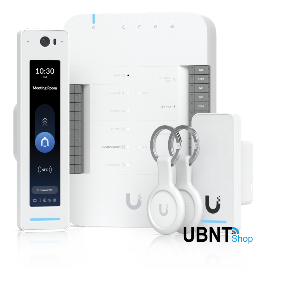 UniFi Access Starter Kit contains everything you need to set up the next generation, state-of-the-art access control system for your business. Compatible with most Electric Bolts/Strikes and Magnetic Locks, the UniFi Access Starter Kit is easily installed with minimal effort and offers the convenience of the UniFi Access Controller, which allows you to easily manage users, visitors, schedules, and access policies. The UniFi Access Starter kit is powered by native PoE technology,