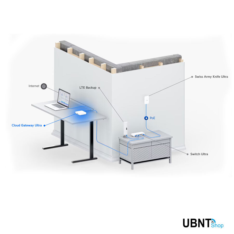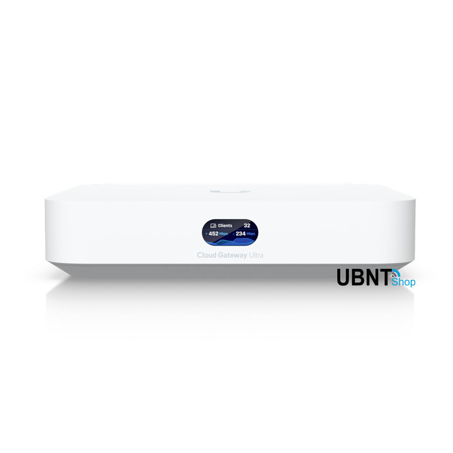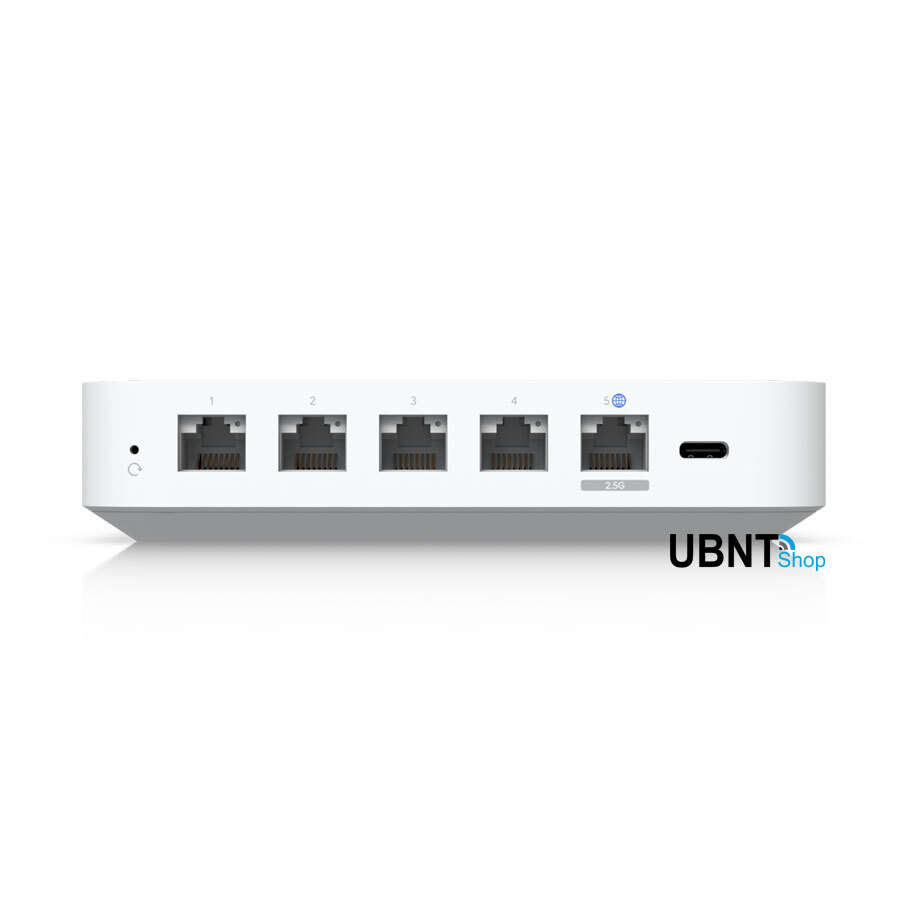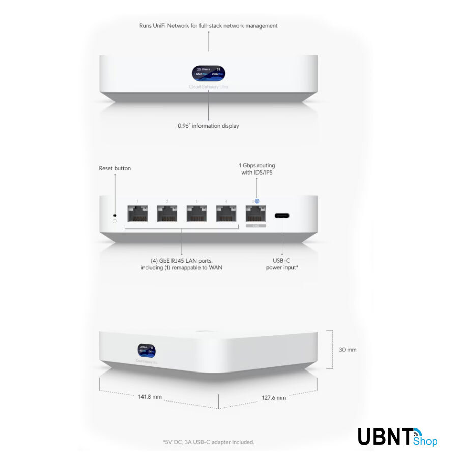UniFi Cloud Gateway Ultra, Multi-WAN, (4) GbE RJ45 ports, (1) 1/2.5 GbE RJ45 ports, USB Type C, 5V DC/3A, 100–240V AC, Max 6.2W
